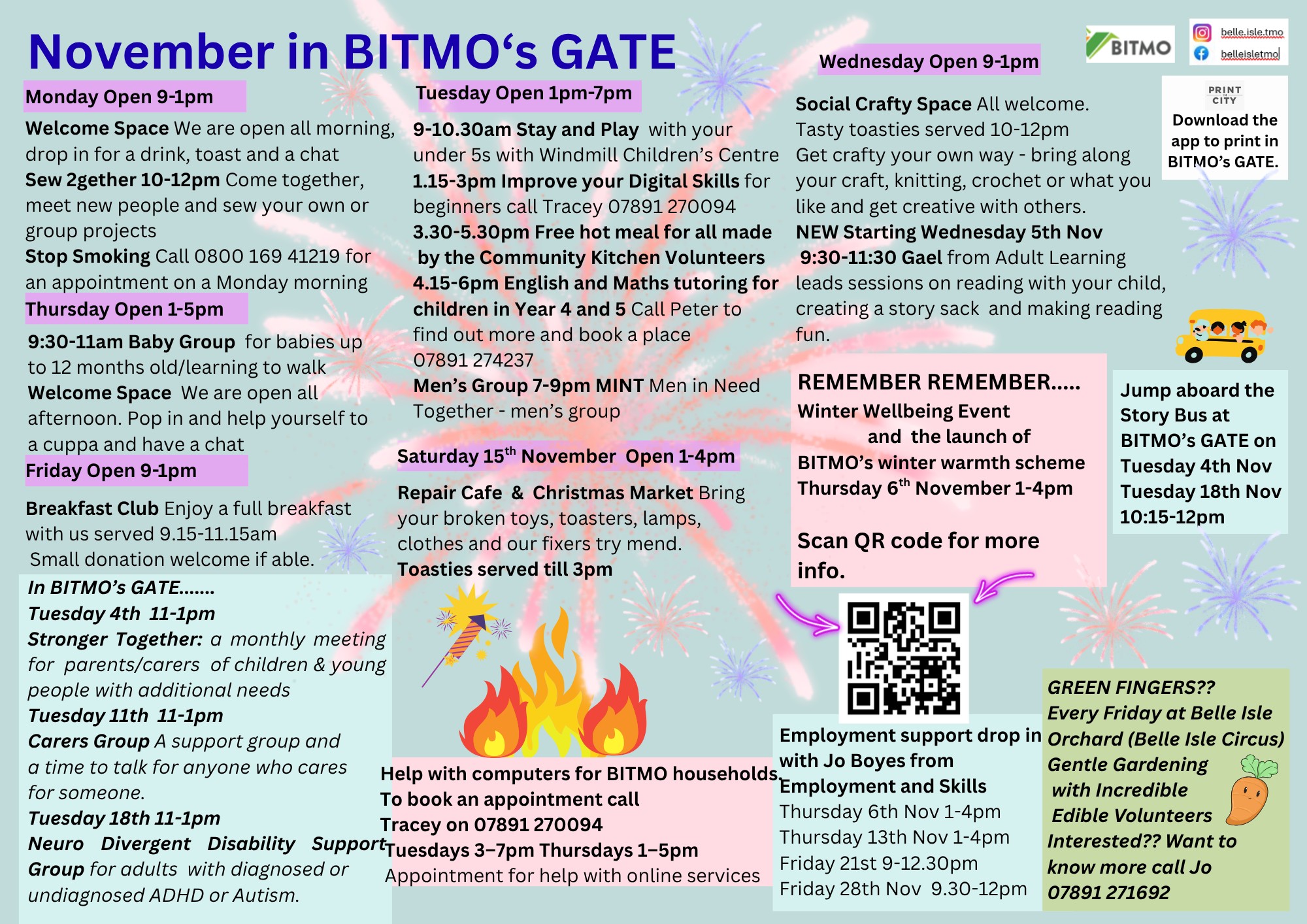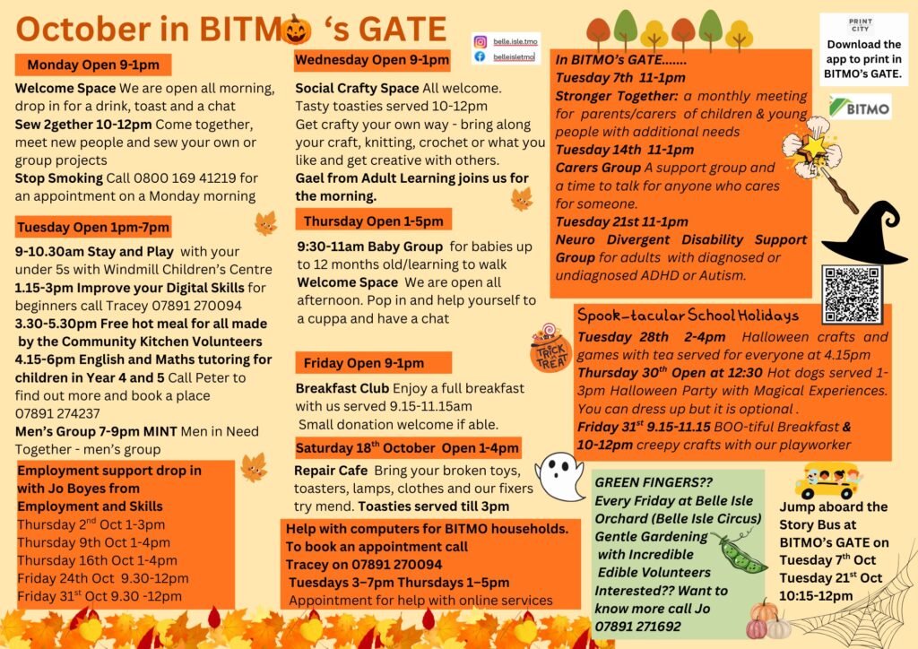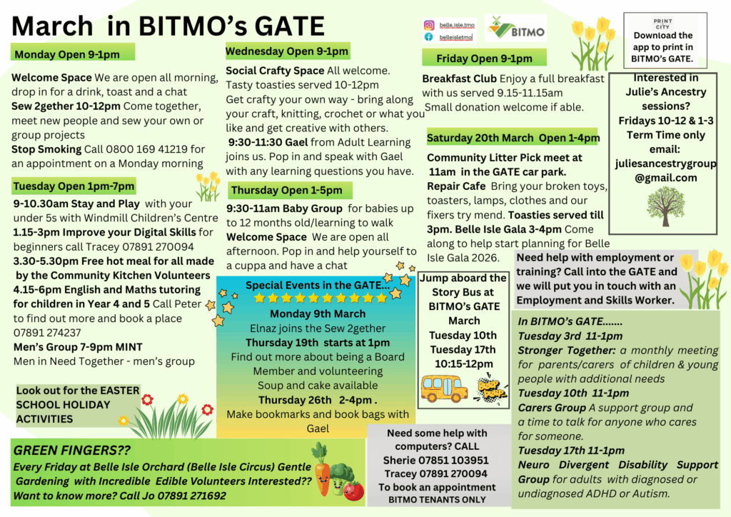 BITMO’s GATE is a community resource centre for Belle Isle. See the programme of activities in the GATE and around Belle Isle below: