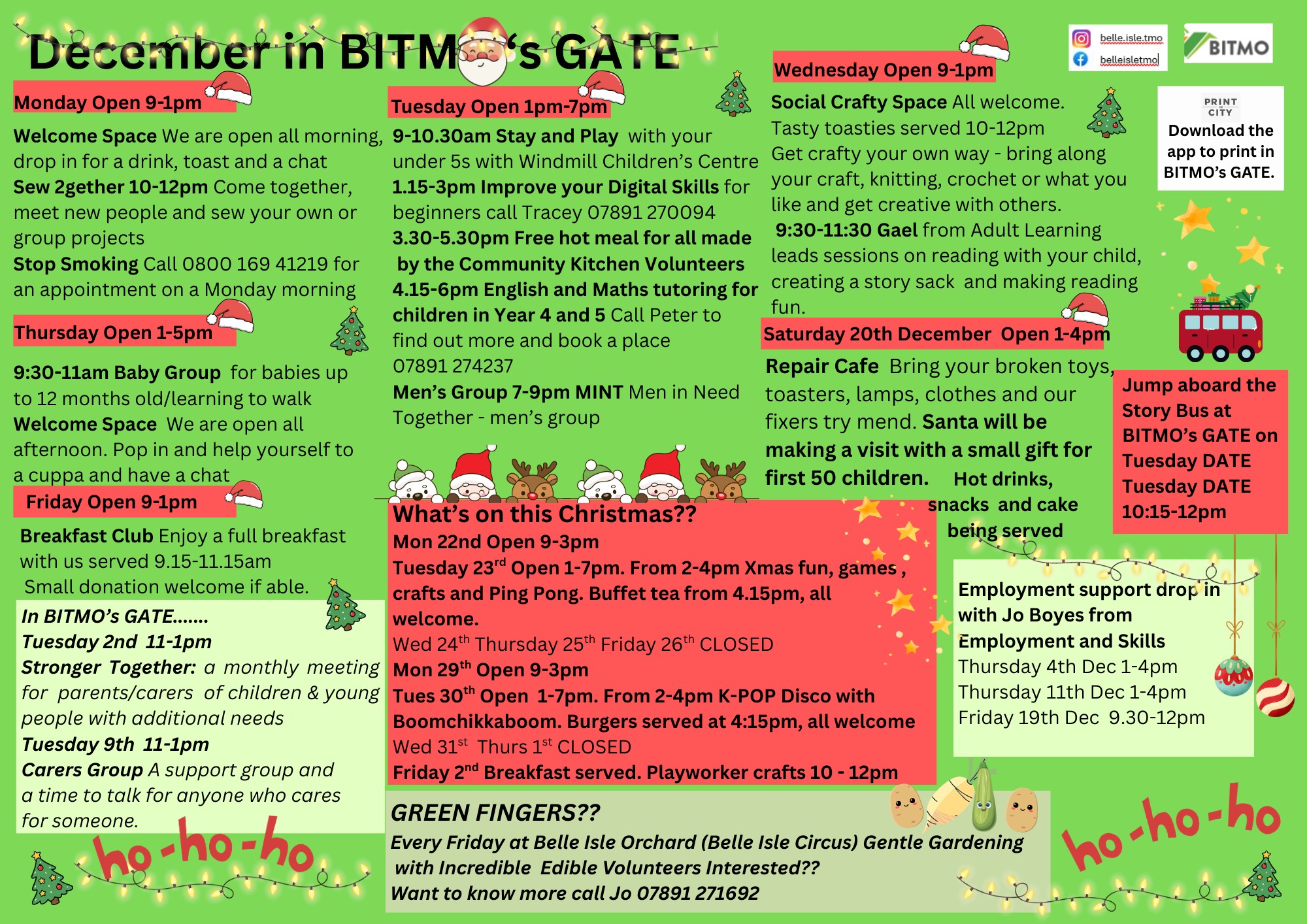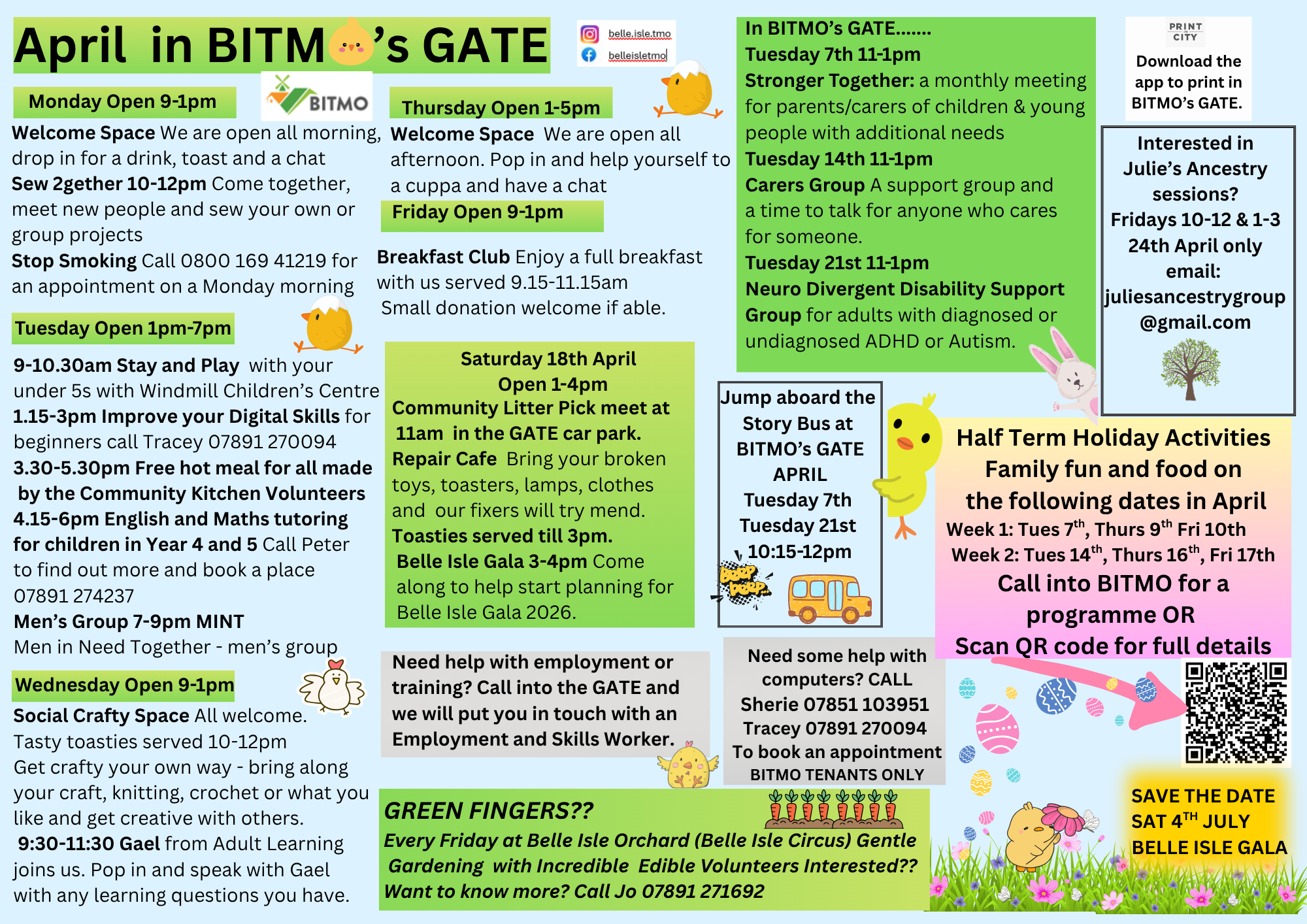 BITMO’s GATE is a community resource centre for Belle Isle. See the programme of activities in the GATE and around Belle Isle below: